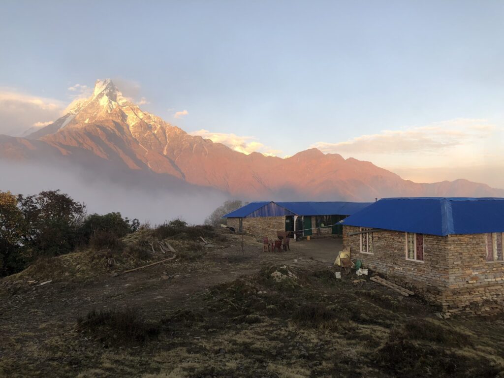 Stone teahouses with blue roofs beneath Mount Machapuchare during sunrise on the Mardi Himal trek